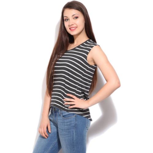 Hypernation Mix And Match Black Body With Black And Grey Striped On Bottom With Thumb Insert Detail Body 100% Cotton Round Neck Full Sleeves Thumb Hole T-shirt For women. Designed To Perfection And They Are So Perfect For The Summer, Ideal For Casual Wear And Regular Fit. This T-shirt Will Go Well With Trousers, Jean, Short And Shoes.